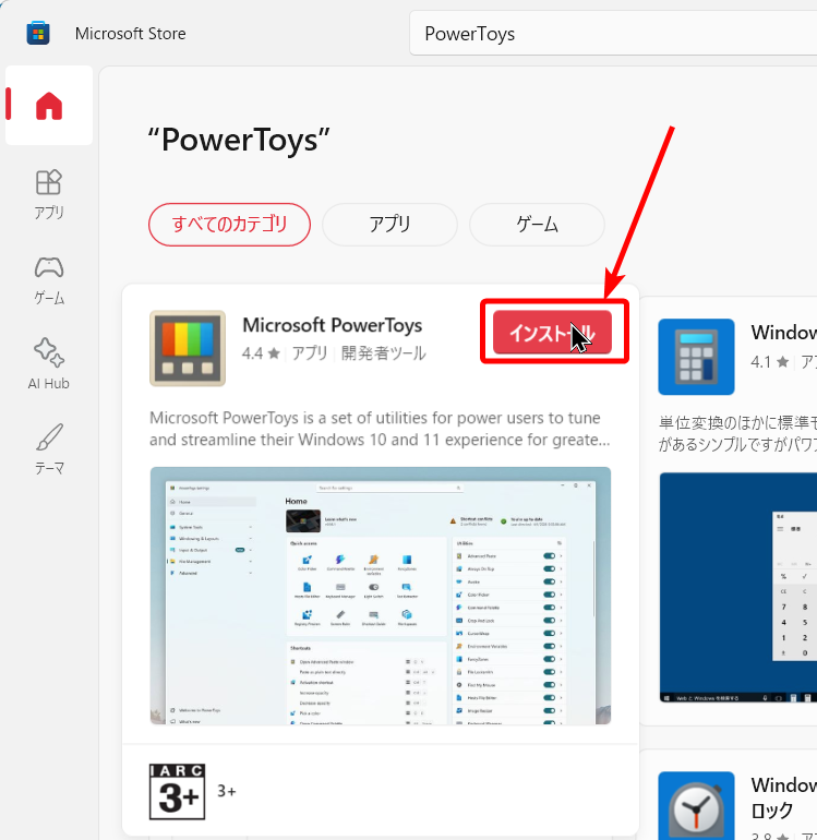 検索結果から「Microsoft PowerToys」を選び、「インストール」ボタンをクリックします。(「無料」と書いてあるところにカーソルを合わせると「インストール」に変わります)