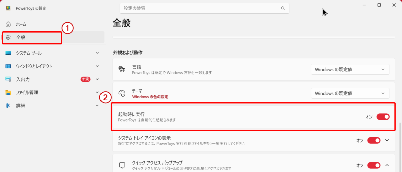 初回起動時は、左側メニューの「全般」を開き「起動時に実行」をオンにしておきましょう。PCを起動するたびに自動でPowerToysが立ち上がるため、毎回手動で起動する手間がなくなります。