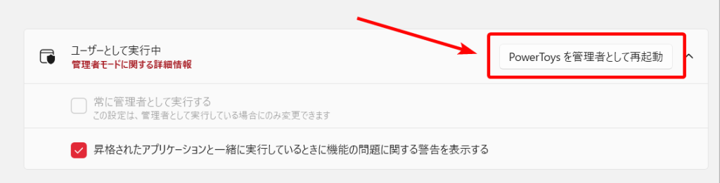 グレーアウトしてチェックができない場合は、「PowerToysを管理者として再起動」してからチェックをしてください。