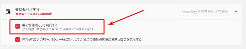 また、同じ画面で「常に管理者として実行する」のトグルもオンにしておくと、一部のショートカットキーがどのアプリ上でも動作するようになります。後述のPowerToys Runをゲームや動画編集ソフトの上から呼び出したい場合は、必ずオンにしておきましょう。