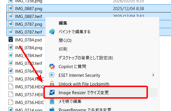 右クリックメニューから「Image Resizerでサイズ変更」を選びます。