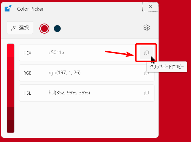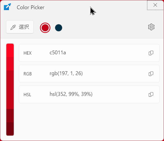 Color Pickerは、画面上の任意のピクセルをクリックするだけで、そのピクセルの色コード(HEX・RGBなど)を取得できる機能です。デフォルトのショートカットは「Win + Shift + C」です。