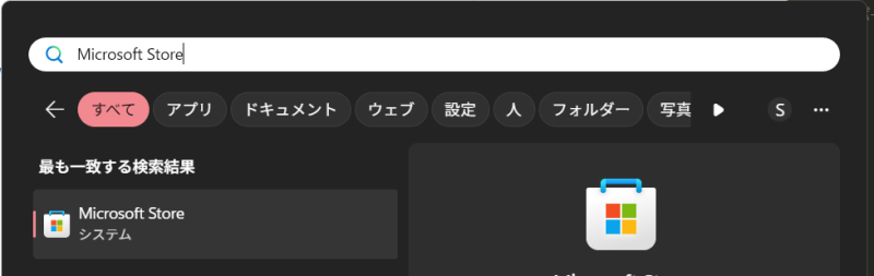 タスクバーまたはスタートボタンをクリック後の検索ボックスに「Microsoft Store」と入力してストアアプリを起動します。