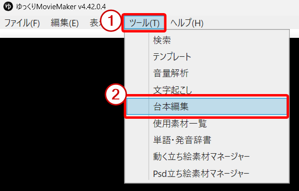 全体の流れは、YMM4のメニューから「台本編集」パネルを開き、そこからファイルを選択してタイムラインに追加する、という手順です。