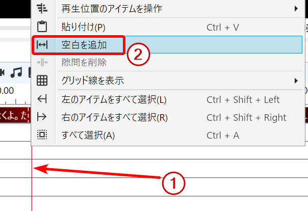 特定のセリフの間だけを調整したい場合は、タイムライン上で調整したい音声アイテムの後ろを再生位置に設定し(①)、右クリックでメニューを出したら「空白を追加」をクリックします。