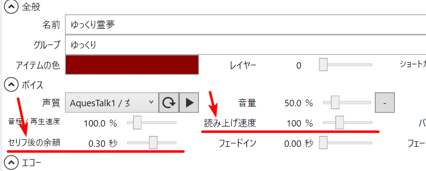 YMM4の「表示」→「キャラクターの編集」から該当キャラクターの設定を開き、「セリフ後の余韻」や「読み上げ速度」といった項目を調整します。その後、一度タイムラインのアイテムを削除して、再度台本を読み込むことで、変更した設定がすべてのセリフに一括で反映されます。