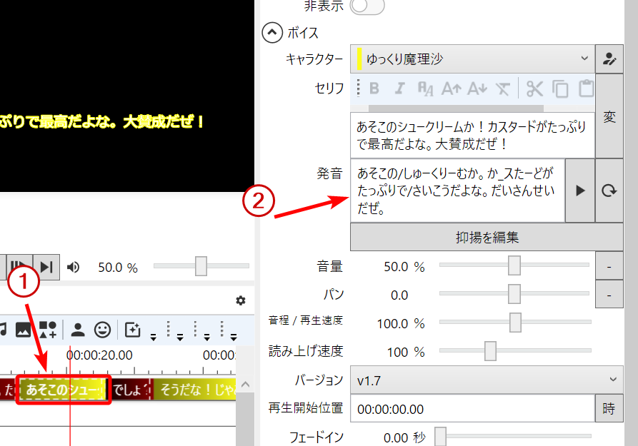 その場合は、該当するアイテムをタイムライン上でクリックして設定画面を開き、「発音」の項目を修正することで、正しい発音に直せます。