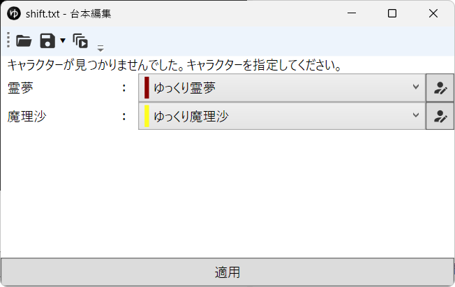 ただし、これはエラーで処理が止まってしまうわけではなく、「キャラクターが見つかりませんでした。キャラクターを指定してください。」という設定画面が表示されます。