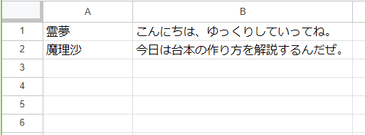 - A列にキャラクター名、B列にセリフを入力していきます。