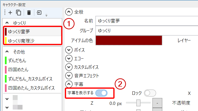 YMM4で字幕を表示させるための第一歩は、キャラクターごとの設定を確認することです。YMM4では、キャラクターごとに「字幕を出すかどうか」を管理しています。