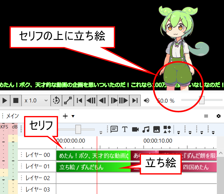 YMM4では、レイヤー番号(タイムラインの行番号)が大きいほど、画面の手前(前面)に表示されます。例えば、セリフがレイヤー0、立ち絵がレイヤー1にある場合、立ち絵の後ろに隠れて見えなくなってしまいます。