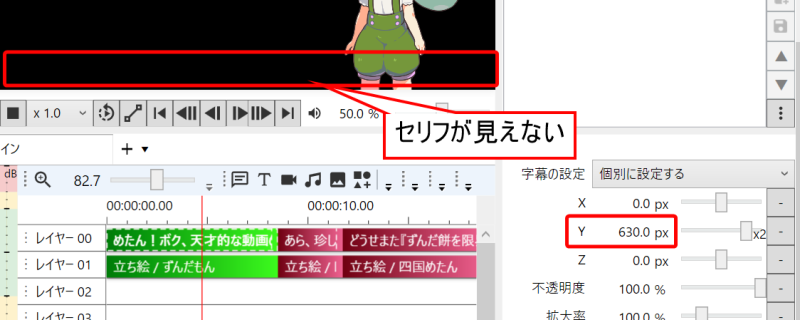 この問題を解決するには、字幕を配置するレイヤー番号を大きくします。一般的には、字幕は一番手前に表示したい要素なので、レイヤー10など、他の要素よりも下の行(番号の大きい行)に配置することをおすすめします。これで、立ち絵や背景の上に字幕が重なって表示されるようになります。