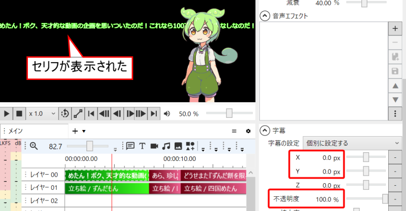 セリフ入力欄に文字を打ち込むと、自動的に音声が生成されるのと同時に画面上に字幕も配置されます。先ほどの「キャラクター設定」で字幕をオンにしておけば、この連携が自動で行われるのです。