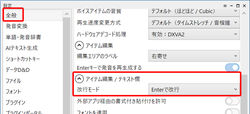 または、「ファイル」→「設定」で、「全般」項目の「アイテム編集/テキスト欄」の「改行モード」を「Enterで改行」にすることで、「Enter」のみで改行が可能になります。