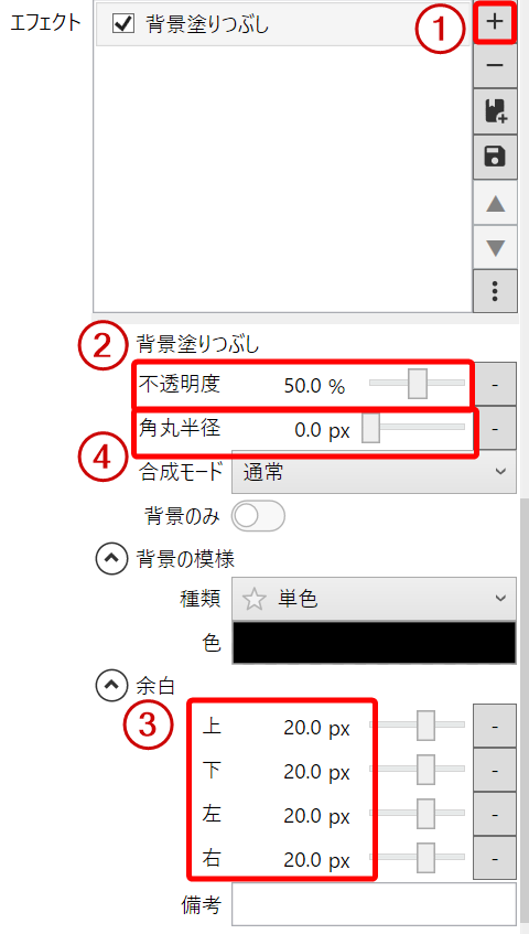 字幕の設定エリアにある「映像エフェクト」の「+」ボタンをクリックし、一覧から「背景塗りつぶし」を選びます(①)。すると、文字の周りに四角い背景がつきます。この背景の色や透明度を調整しましょう。黒色の半透明(不透明度50%くらい)にすると、テレビ番組のような洗練された雰囲気になります(②)。