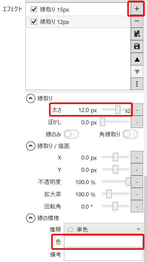 エフェクトの「+」ボタンから「縁取り」を追加してみましょう。ここでは、縁取りの色や太さを自由に設定できます。さらに、この「縁取り」エフェクトは重ねがけができます。例えば、最初に太い白の縁取りをつけ、その上からもう一度「縁取り」エフェクトを追加して細い黒の縁取りをつけることで、二重のフチ(ダブルストローク)を作ることができます。