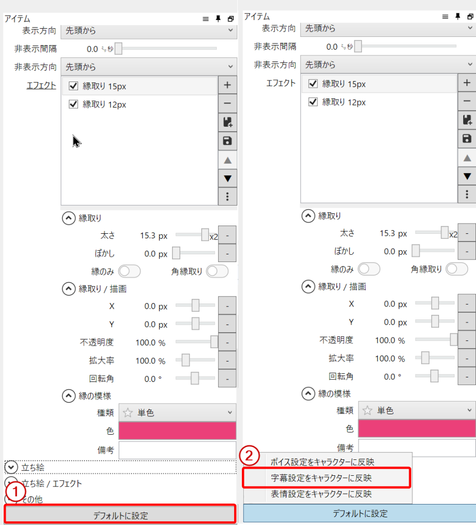 一度作った理想の設定(エフェクトの種類や数値)の下にある「デフォルトに設定」→「字幕設定をキャラクターに反映」をクリックすることで、そのキャラクターの字幕全てが設定したデザインに変わります。