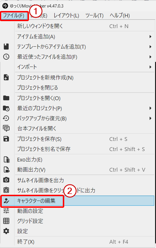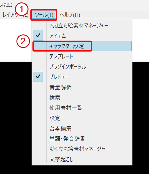 まずは、画面上部のメニューにある「ツール」をクリックし、その中から「キャラクター設定」または、「ファイル」→「キャラクターの編集」を選んで設定画面を開いてください。