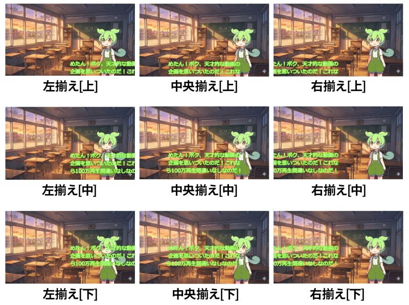 字幕の位置を決める際、「文字揃え」の設定も非常に重要です。これは、文字数が増えたり改行したりしたときに、どの位置を基準に文字が広がるかを決めるものです。